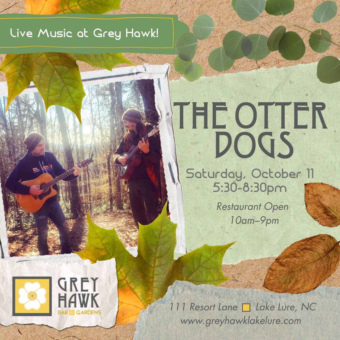 Back to All Events The Otter Dogs Saturday, October 11, 2025 5:30 PM 8:30 PM Google Calendar ICS The Otter Dogs perform at Grey Hawk Bar & Gardens! They take the stage from 5:30pm-8:30pm – and we’re open from 10am-9pm for brunch, lunch, and dinner!