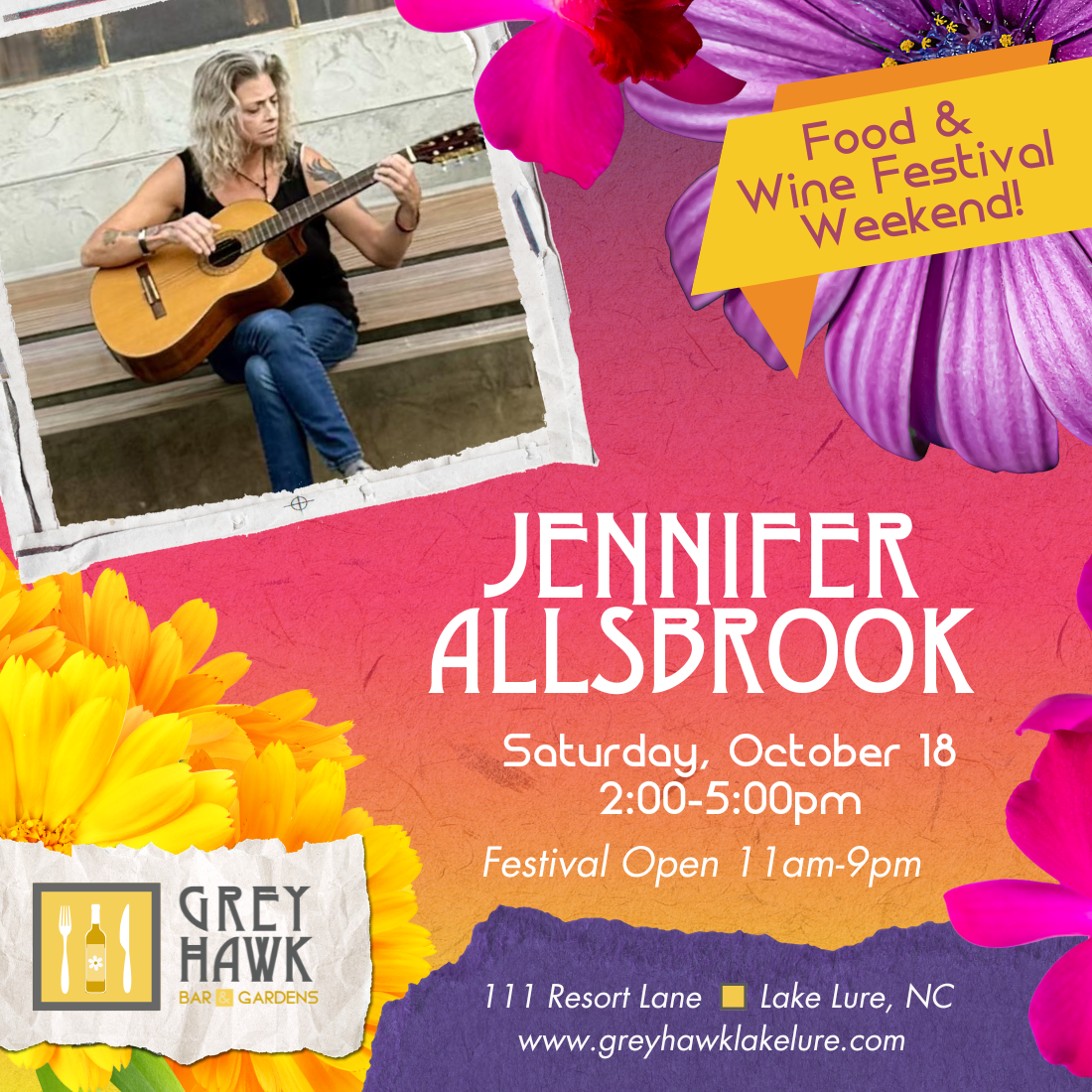 Jennifer Allsbrook performs at Grey Hawk Bar & Gardens! She takes the the stage from 2pm-5pm – and we’re open from 11am-9pm. Don’t miss the weekend-long FOOD & WINE FESTIVAL – Learn everything about The Food & Wine Festival by clicking here.