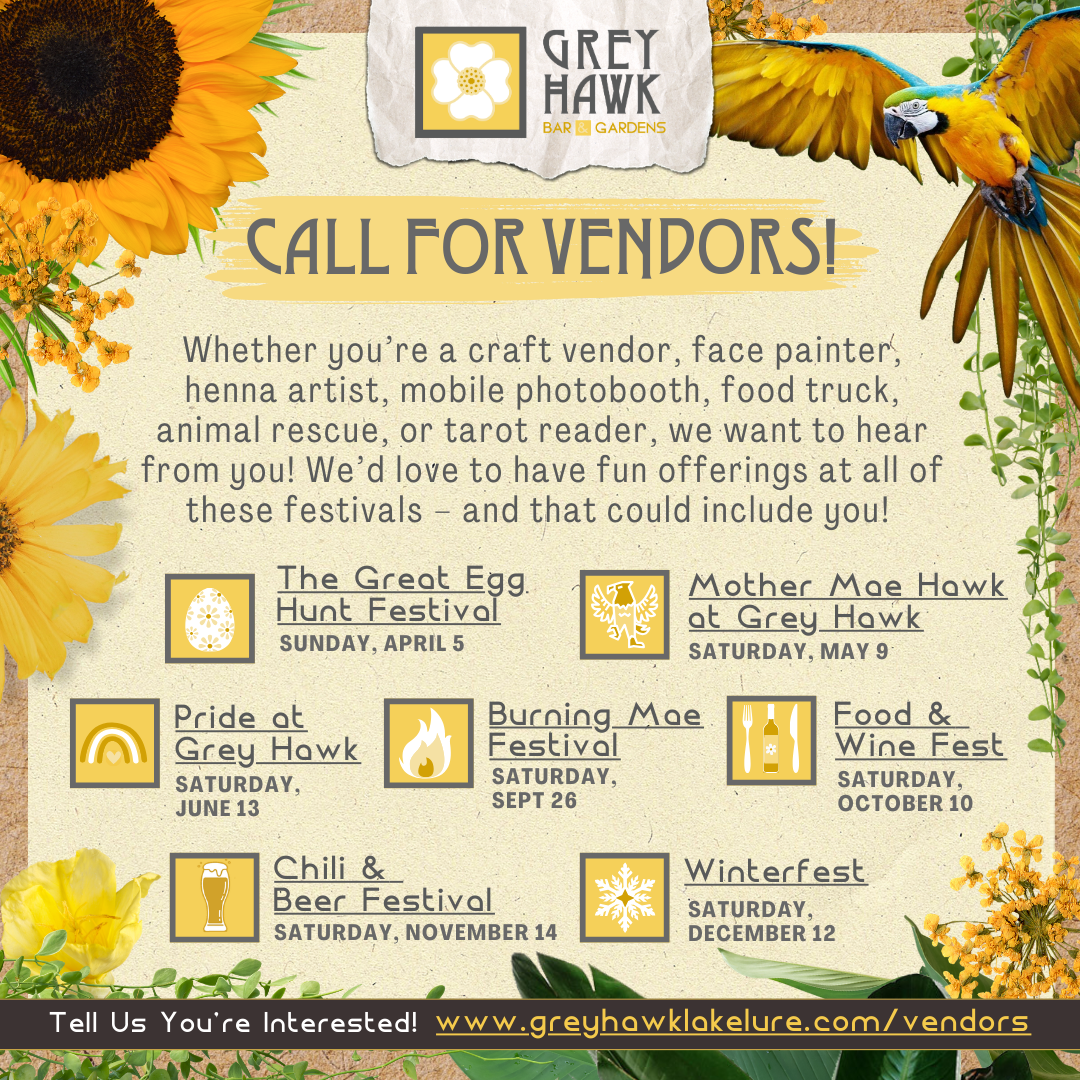 Grey Hawk Bar & Gardens has a fun line-up of “festival”-style events all throughout 2026, and we’d love to share our fun space with vendors, artisans, makers, and more. Want to join us? Fill out this form and let us know you’re interested, and we’ll be in touch!