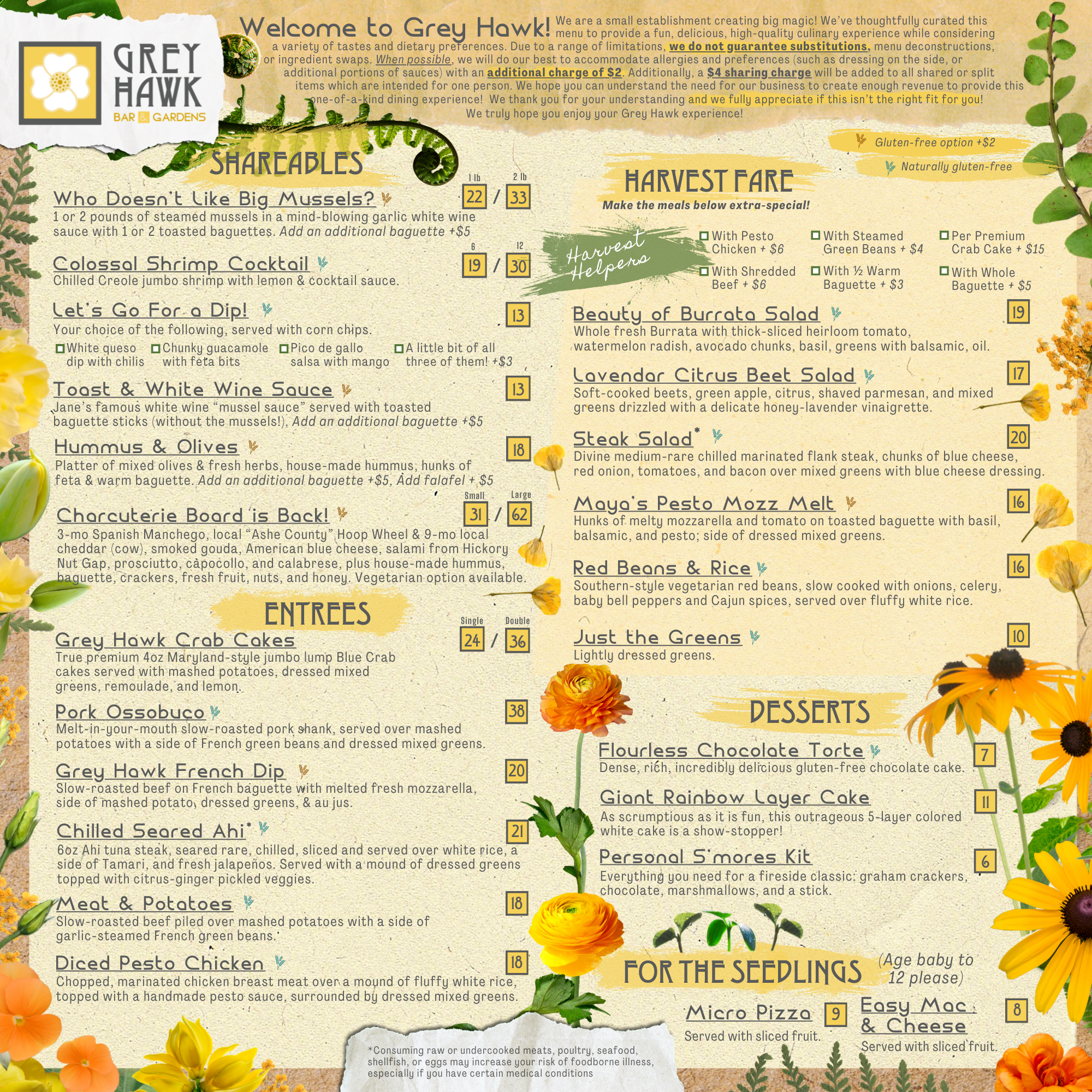 Available when Grey Hawk is open, weather-permitting (in addition to our full menus). Offerings and prices vary each week, but this will give you a general sense of what we offer: