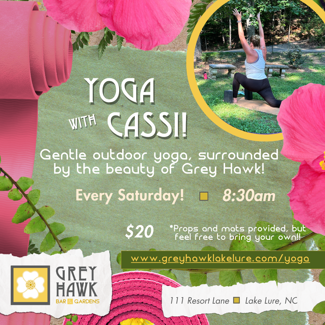 Join us EVERY Saturday morning at 8:30am for Yoga at Grey Hawk, offered by certified Yoga teacher Cassi Dunmire! This class will feature gentle yoga surrounded by the beauty of the Grey Hawk gardens. Please indicate on the form to the right which class you’re signing up for.